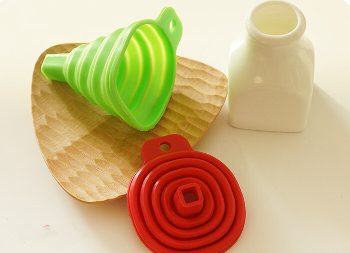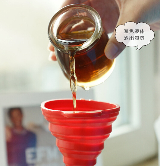 1、創意矽膠折疊漏鬥,用於廚房內醬油、料酒等的灌裝,食品級矽膠材質,持久耐用