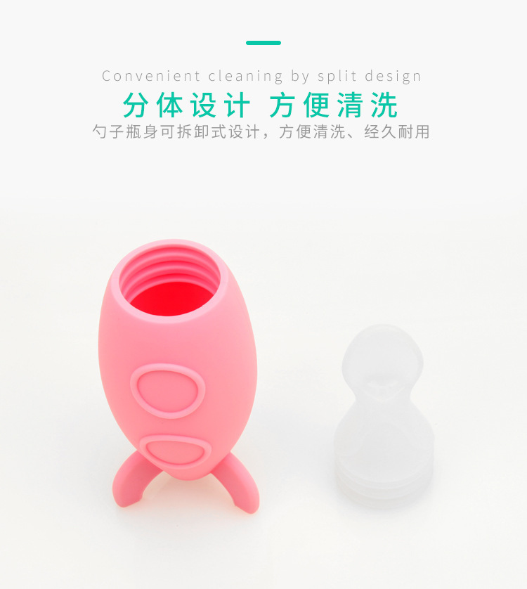 產品用途:輕輕擠壓瓶身,食物會自動流到勺子上麵,告別了一手勺一手碗的煩惱,讓您騰出另一隻手來照顧寶寶和安撫寶寶。瓶底是可站立設計,方便拿放。