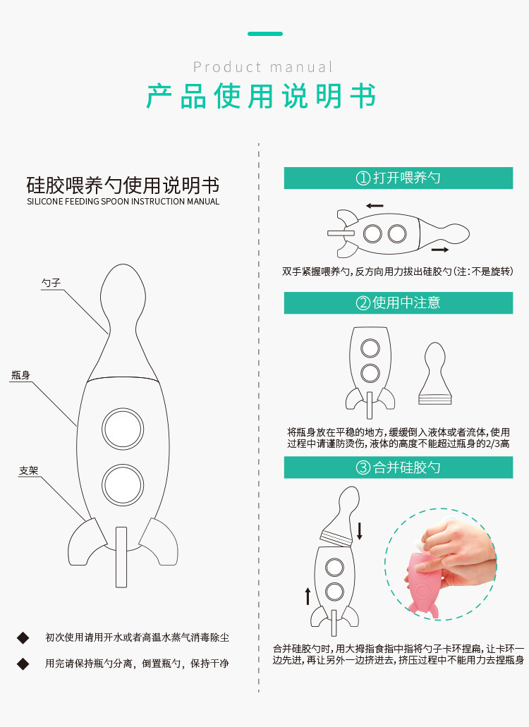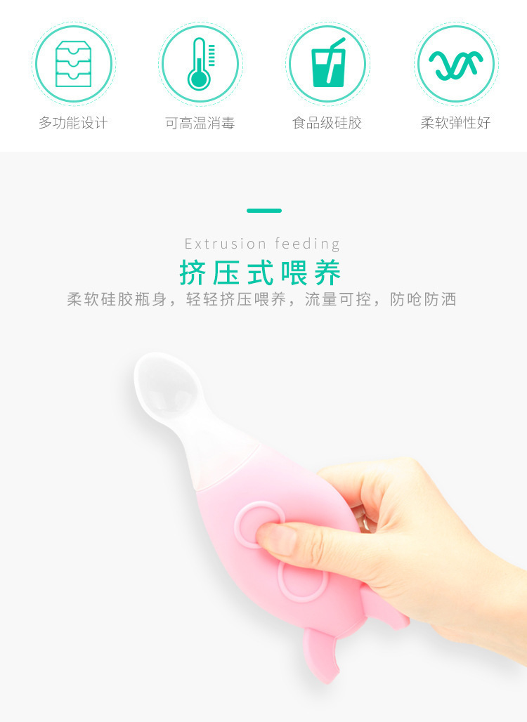 1、碗勺一體,輕鬆喂養,擠壓式設計,解放雙手,解決喂養煩惱
