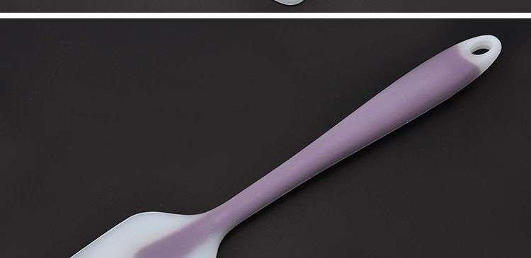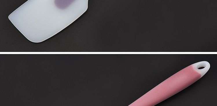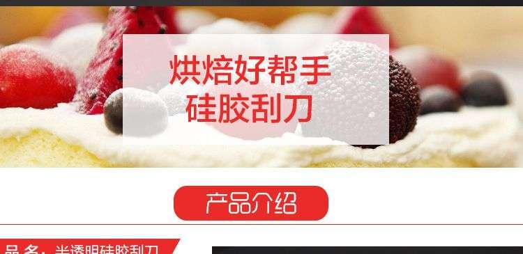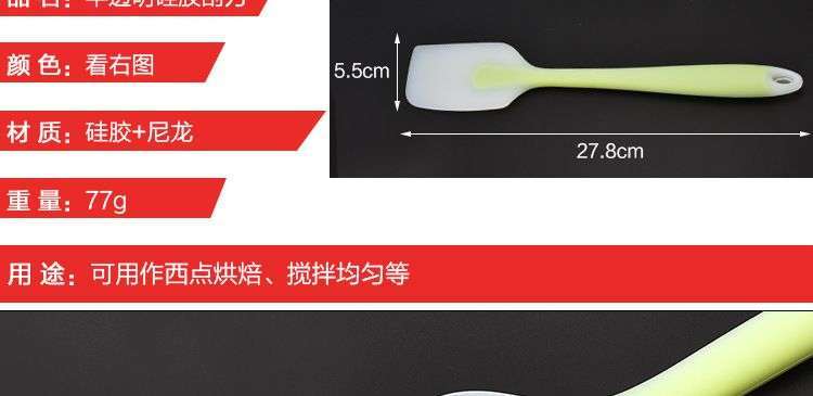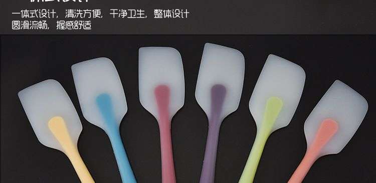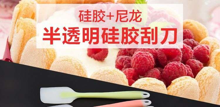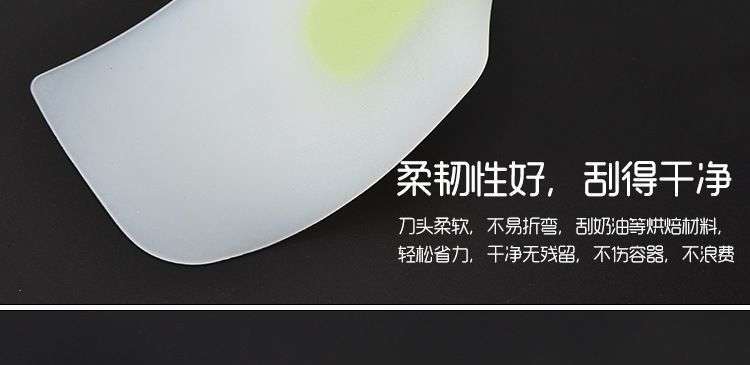 【用途】做蛋糕,攪拌蛋白和蛋糕麵糊均勻而不消泡;可有效刮淨攪拌盆表麵的殘留麵糊、蛋白糊,集中食材並再次利用,減少損耗;抹平倒入模具中的麵糊等等;清洗方便用於刮去不沾烤盤、不沾布、鋁合金烤盤等上麵的殘渣、碎屑,不會刮傷產品表麵。