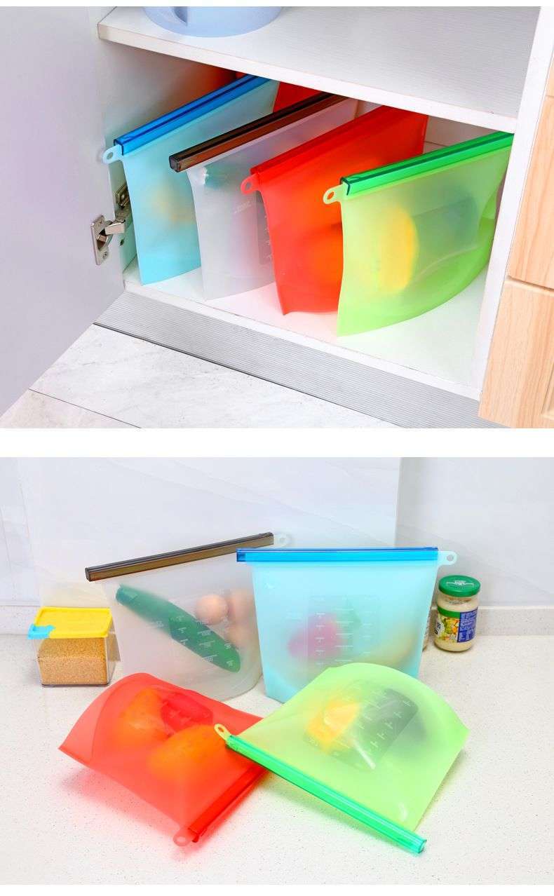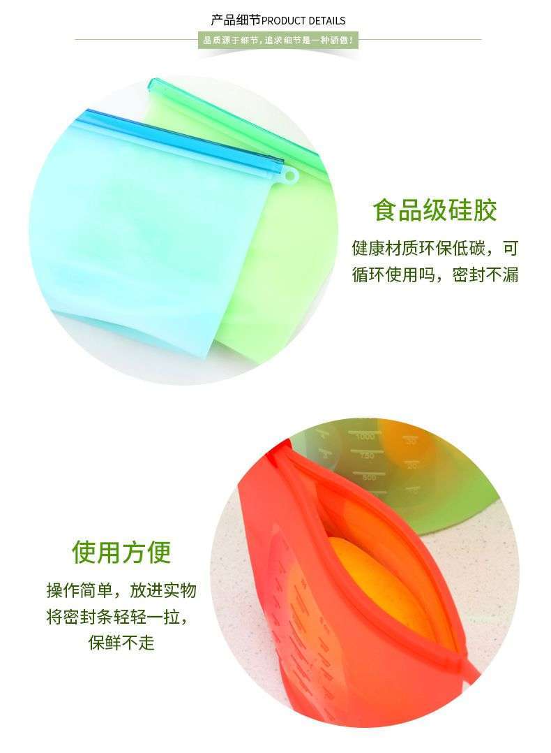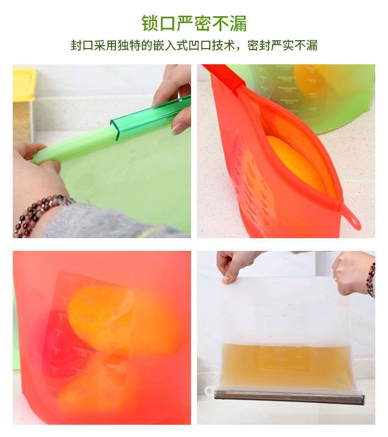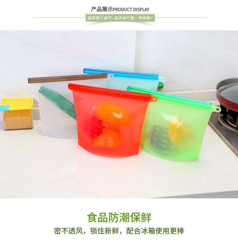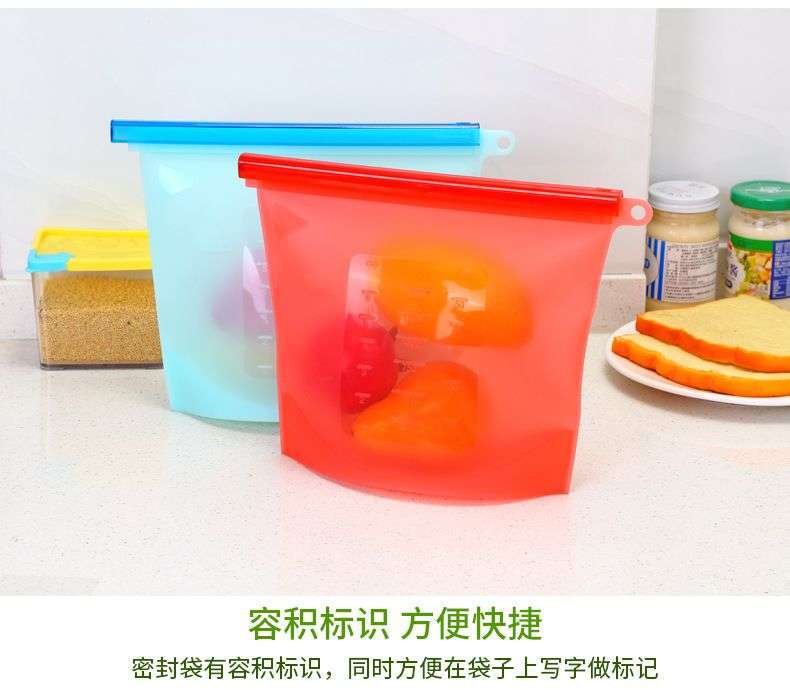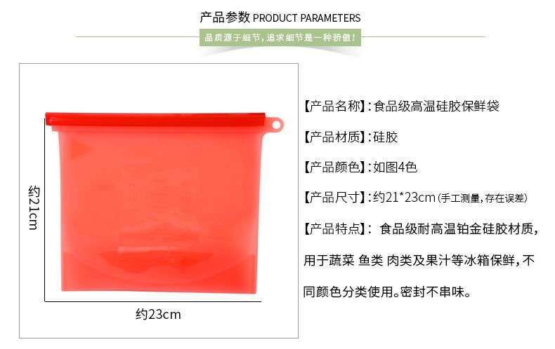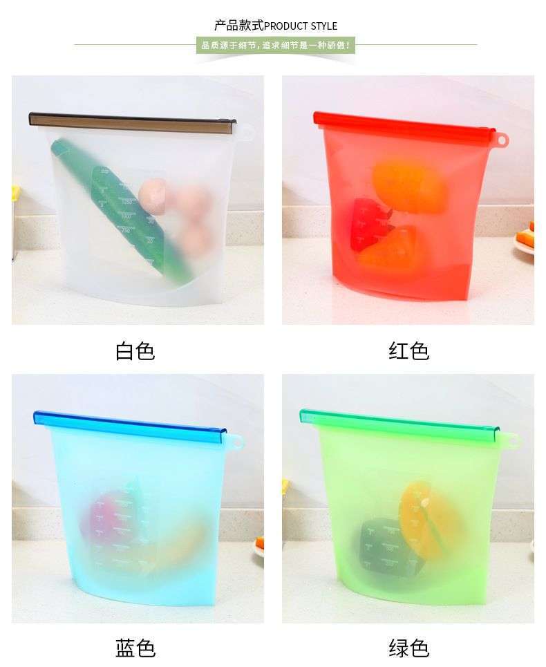 產品特點:食品級矽膠材質,健康環保,拉條設計,密封強,開取方便,蔬菜、魚類、肉類、和果汁都可以存放,不同顏色可以分類使用